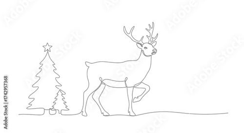 Fototapeta premium Minimalist Christmas illustration A one-line drawing of a reindeer with Christmas tree, simple design for festive holiday decorations