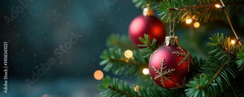 © Phennapha, Naklejka premium Minimalist Christmas tree background with ornaments and lights, festive atmosphere, Christmas tree