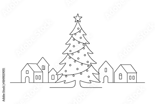 © MarryBerry, Fototapeta premium Minimalist Christmas Tree. "Christmas tree in village center illuminated with lights". Minimalistic one-line