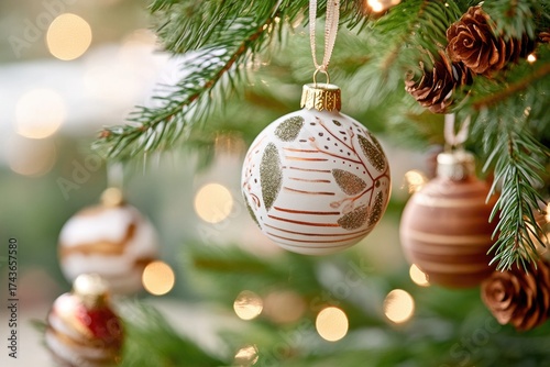 Fototapeta premium Minimalist christmas tree decor with rustic wooden ornaments