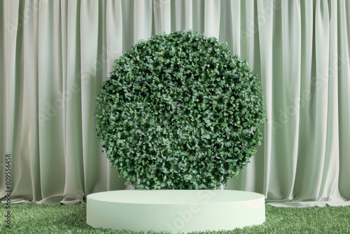 Fototapeta premium Minimalist Circular Green Foliage Display with White Curtains