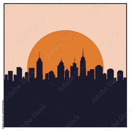 © Roman Stock studio, Fototapeta premium Minimalist city skyline silhouette with orange sun.