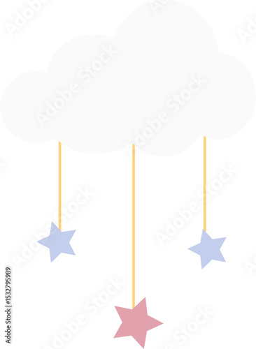 Obraz premium Minimalist cloud design is showing pastel stars hanging on gold rods over transparent background