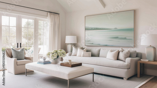 Fototapeta premium Minimalist Coastal Living Room Interior with Soft Neutral Tones and Ocean View