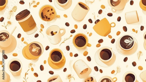 © kkkiim graphic, Obraz premium Minimalist Coffee Bean Mug Cup Seamless Pattern on a White Background