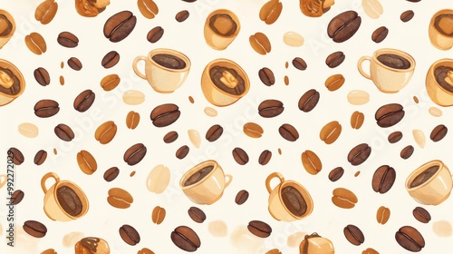 © kkkiim graphic, Obraz premium Minimalist Coffee Bean Mug Cup Seamless Pattern on a White Background