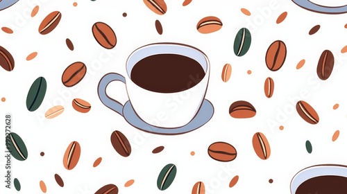 © kkkiim graphic, Obraz premium Minimalist Coffee Bean Mug Cup Seamless Pattern on a White Background