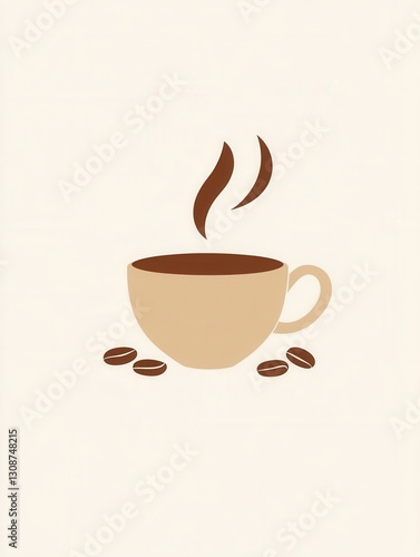 © Anat art, Obraz premium Minimalist coffee cup design featuring steam and scattered coffee beans in warm tones