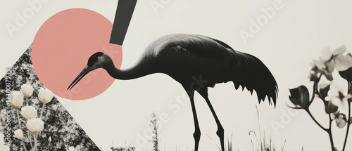 Fototapeta premium Minimalist collage featuring a crane in a marsh with floral accents