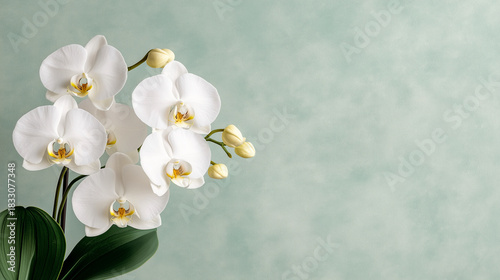 © vannet, Obraz premium Minimalist composition of delicate white orchids blossoming amidst lush green leaves, clean background and subtle gradients, palette of matte cream, pastel aqua, and vivid emerald, floral design, AI