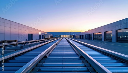 Obraz premium Minimalist Conveyor Belts in Fulfillment Center During Dusk Sky
