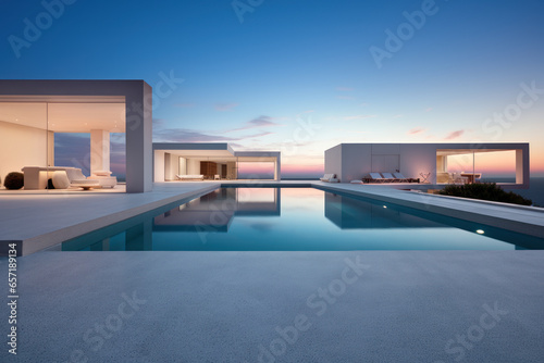 Fototapeta premium Minimalist cubic house exterior with swimming pool, modern country house, seaside holiday in modern villa, sunset view
