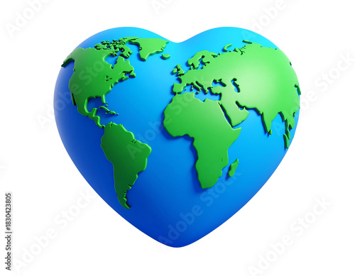 Fototapeta premium Minimalist 3D Heart Earth Icon, Smooth Blue and Green Plastic, Stylized Continents, Isolated