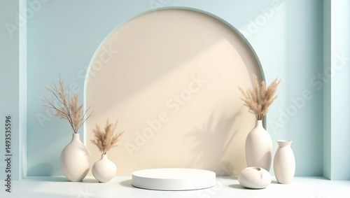 © Pervez Ahammad, Fototapeta premium Minimalist 3D Render of Product Display Podium with Pampas Grass and Ceramic Vases in Soft Pastel Interior
