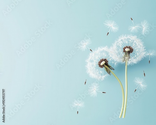 Obraz premium Minimalist dandelion seeds blowing in wind, gentle watercolor flow