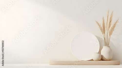 Fototapeta premium Minimalist decor with white plates and dried plants on wooden shelf