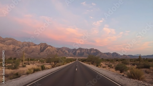 Fototapeta premium Minimalist Desert Road at Sunset with Pastel Sky and Distant Mountains.