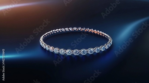 © Boonnam Burart, Fototapeta premium Minimalist diamond bracelet lying in a gentle curve on a smooth navy background with soft gradient lighting