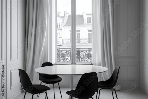© Mane, Fototapeta premium Minimalist dining area with view of city buildings