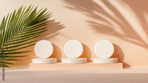 Fototapeta premium Minimalist display, podiums, palm leaf, shadows, product presentation, light beige backdrop, empty display stand, modern design