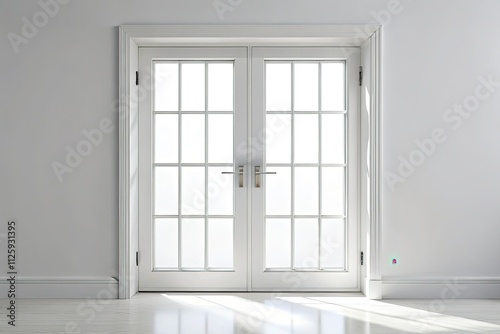 Fototapeta premium Minimalist Double Door Window, White Background, Interior Design, Modern Architecture, Glass Doors, Clean Lines, Simple Design, Architectural Photography