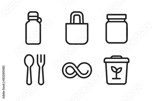Fototapeta premium Minimalist eco-friendly icons with water bottle, tote bag, and recycle bin