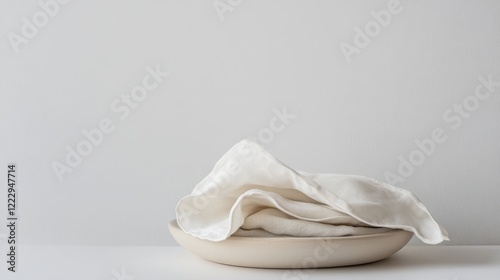 © CryptoCanvas, Obraz premium Minimalist eco-friendly linen washcloths on a ceramic plate promoting zero waste sustainable lifestyle with a simple white backdrop