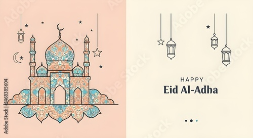 © Snsarah, Naklejka premium Minimalist Eid al-Adha Illustration with Mosque and Lanterns