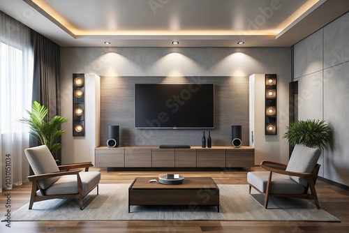 © Hugnaka, Fototapeta premium Minimalist entertainment area with sleek TV console, speakers, and cozy seating