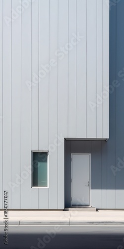 Fototapeta premium Minimalist exterior of a modern building featuring a single door and a small window against a light gray facade.