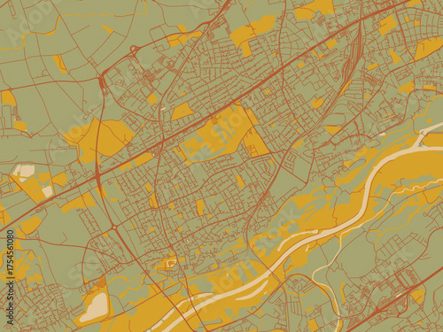 © W&S Stock, Fototapeta premium Minimalist flat city map of Traun, Austria with olive backdrop with warm rust street network and ochre blocks.
