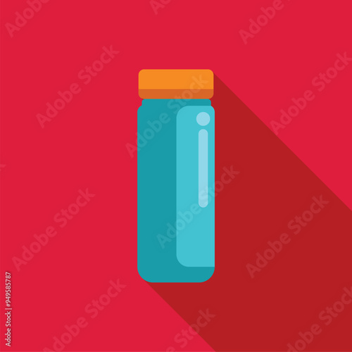 Fototapeta premium Minimalist flat design icon of a blue water bottle with an orange cap, casting a long shadow on a red background