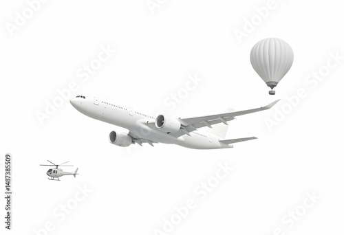 Fototapeta premium Minimalist flat illustration of air transportation including airplane, helicopter, hot air balloon, and drone, isolated on white background, simple modern vector style, smooth lines, pastel color tone