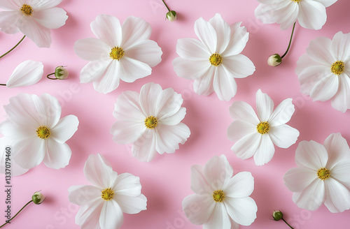 © Muhammad, Obraz premium Minimalist Flat Lay of White Cosmos Flowers on Pink Background – Aesthetic Floral Pattern for Wedding Cards, Birthday Cards, Product Packaging & Social Media Design