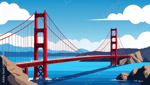 Obraz premium Minimalist flat vector Golden Gate Bridge, red simplified structure, blue...