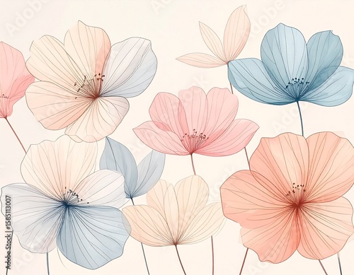 © file, Obraz premium "Minimalist floral background, organic paper texture, finely detailed line art flowers, pastel color palette, clean composition, full HD."