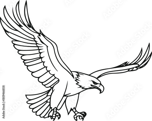 Obraz premium Minimalist flying eagle line art, wings spread wide, clean black outline on white background, elegant vector style