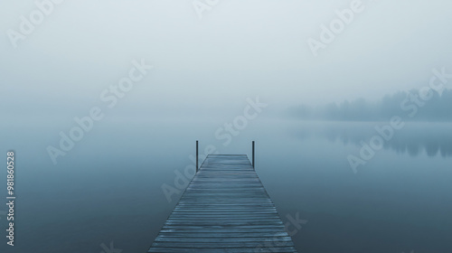 Fototapeta premium minimalist foggy lake with wooden dock and reflections