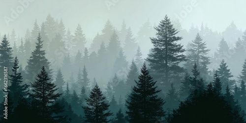 © AzT, Obraz premium Minimalist forest background featuring stylized pine trees and a light fog. Clean and serene design, sense of tranquility and natural beauty, perfect for a modern and calming backdrop.