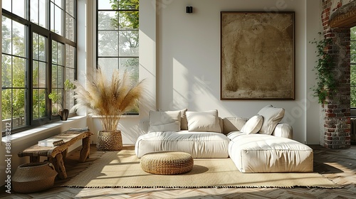 © Helens, Obraz premium Minimalist Frame Mockup: Nomadic Interior Setting, 3D Render