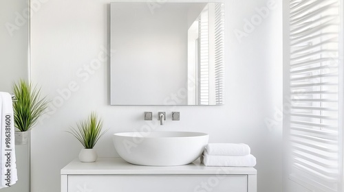 © LIPO@SEXTAO22, Obraz premium Minimalist frameless mirror with brushed steel fixtures in a clean white bathroom, minimalist bathroom mirror, sleek simplicity