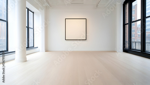 © CHURIN, Obraz premium Minimalist gallery interior with large blank canvas, hardwood floors, and expansive windows