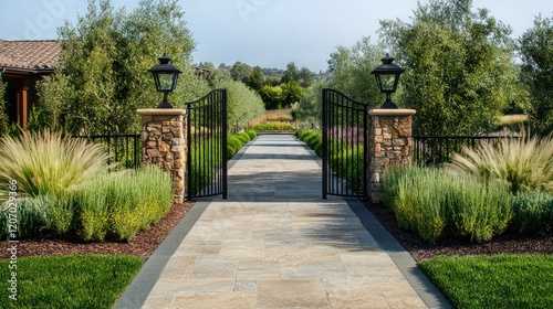 © Soulin7, Obraz premium Minimalist gate paired with green landscaping, featuring ornamental grasses and a stone-paved pathway