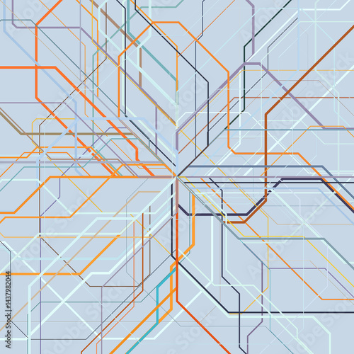 © Lidia Springer, Fototapeta premium Minimalist Geometric Web of Colored Lines on Blue Background – Abstract Urban Map Pattern