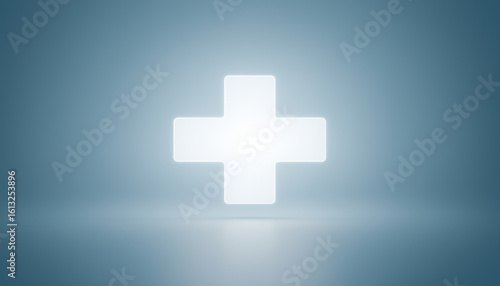 Fototapeta premium Minimalist glowing white plus symbol on soft blue-gray background in clean...