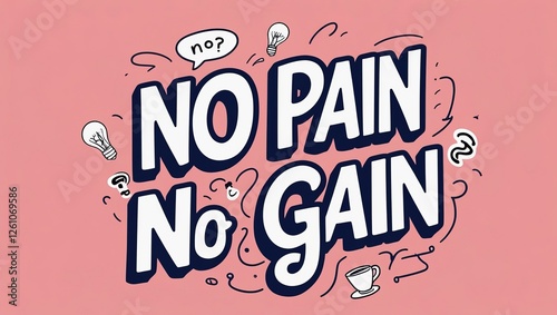 Fototapeta premium Minimalist graphic: 'No Pain No Gain' in bold, playful hand-lettering. Doodles: light bulbs, coffee cups, question marks. Soft coral background, white and navy accents, uplifting vibe.