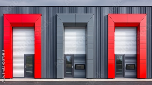 © 海翰 章, Fototapeta premium Minimalist Gray and Red Metal Building with Windows and White Roller Shutter Doors Against a Gray Sky. Modern Industrial Architecture and Abstract Geometric Design Concept.