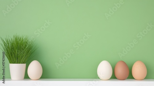 © Yulia, Fototapeta premium Minimalist green interior with decorative eggs and plant on shelf
