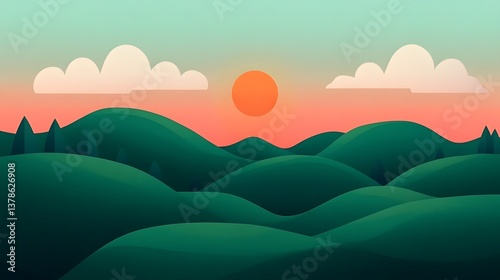 © pkproject, Obraz premium Minimalist Green Landscape with Fluffy Clouds and Glowing Sun in Flat Style