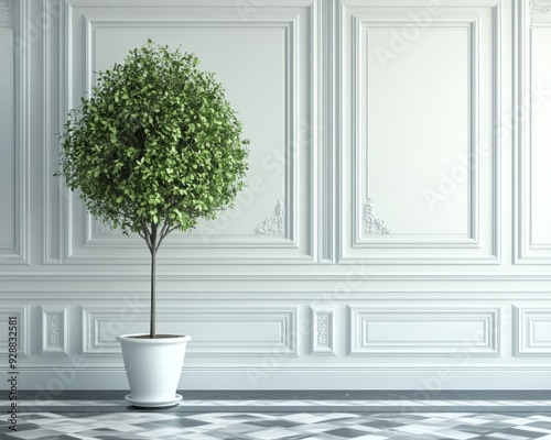 © Kittipong, Fototapeta premium Minimalist Green Plant in White Room A LowAngle View of a Lush Green Plant in a White Pot Standing Against an Elegant White Paneled Wall